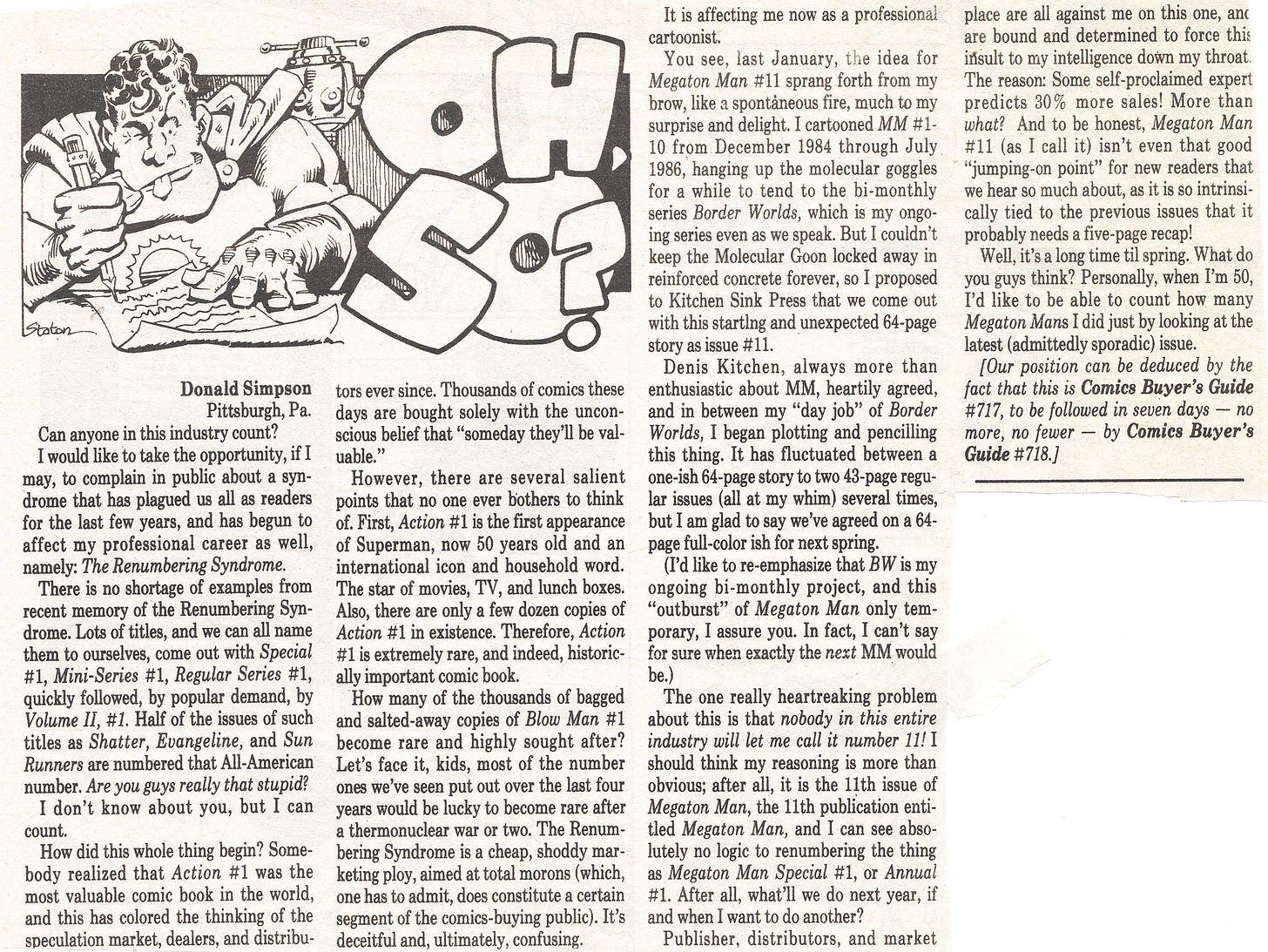 Those who side with Denis—an important figure in the history of comics, to be sure, and one who comes across as reasonable and well-spoken even when it’s not apparent that he’s exaggerating, plausibly denying, and conveniently forgetting pertinent facts—seem to think that the renumbering of Megaton Man was simply a marketing gimmick—good or bad—and to which I should have easily found a workaround.