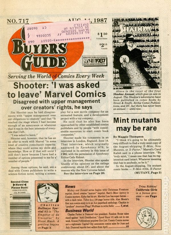 For those of us in comics, luckily, we had letters pages in our own comics. But more importantly, for a public square, if you will, we had the letters page in something called The Comics Buyer’s Guide, a weekly newspaper published by Krause Publications in Iola, Wisconsin (with one stop light amid endless cornfields), edited by Don and Maggie Thompson.