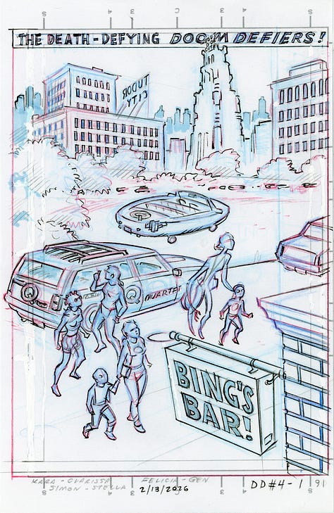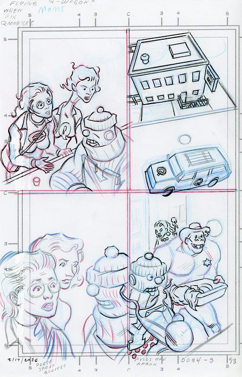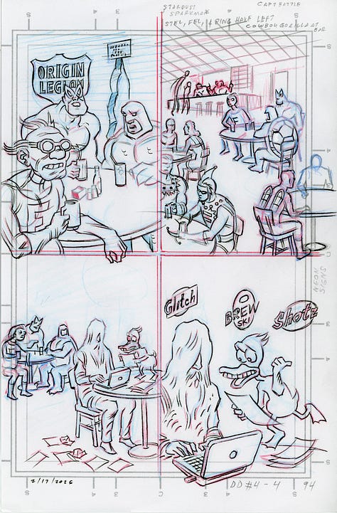 I’ve reverted to the quarter-size rough thumbnails I used back in the late eighties for various projects including Wasteland and Megaton Man #11 for this sequence I’m working on for Megaton Man and the Doom Defiers—a project that is in the queue well behind other projects, so don’t plan on ordering it any time soon; it’s still on the ol’ drawing board.