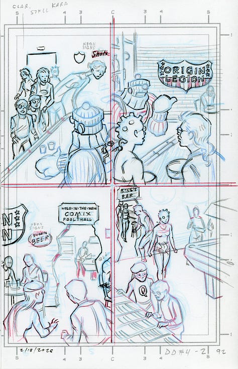 Bing’s Bar is also the hangout of the Origin Legion (from Yarn Man #1), so expect even more old friends to crop up in subsequent pages.