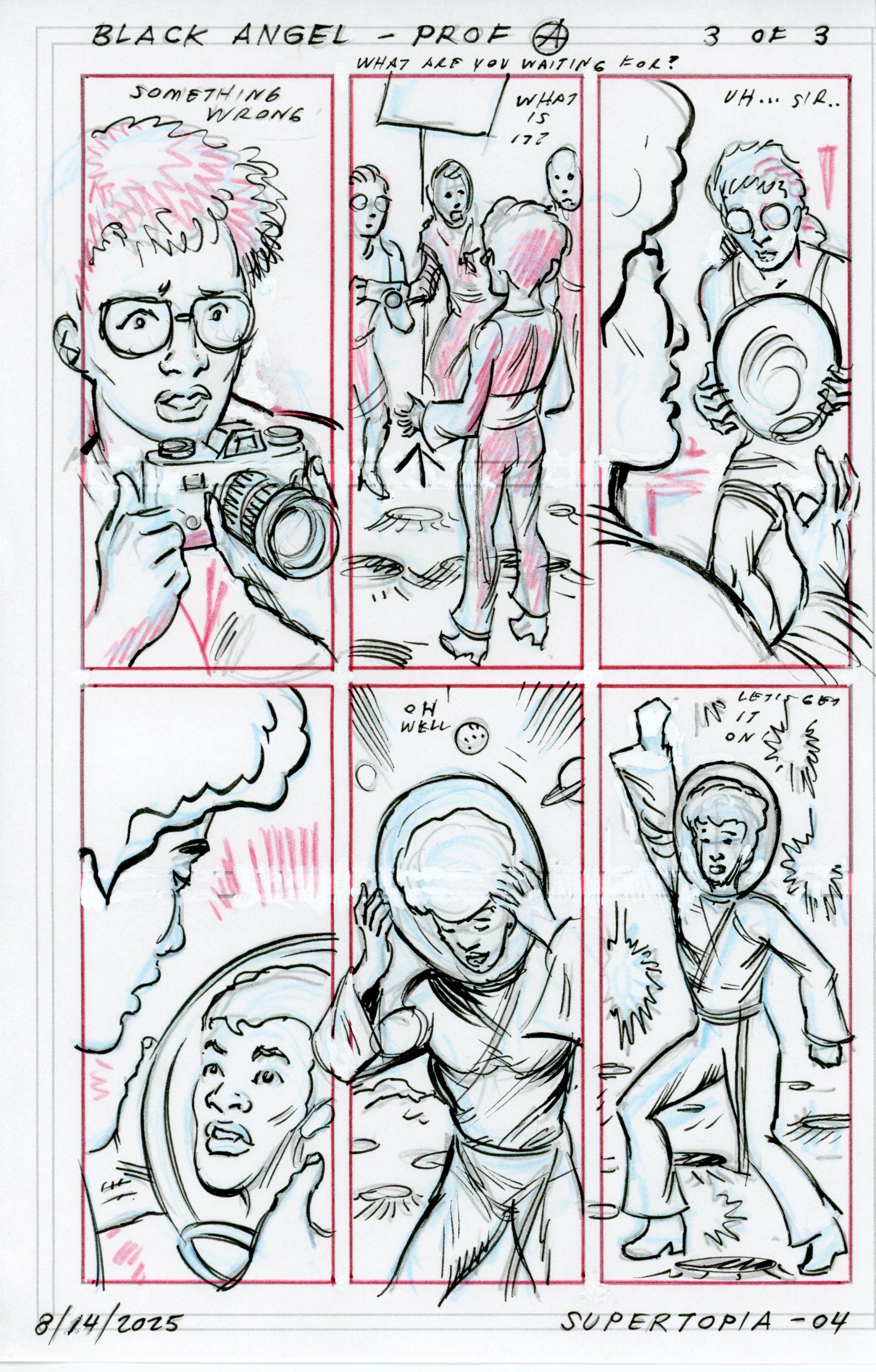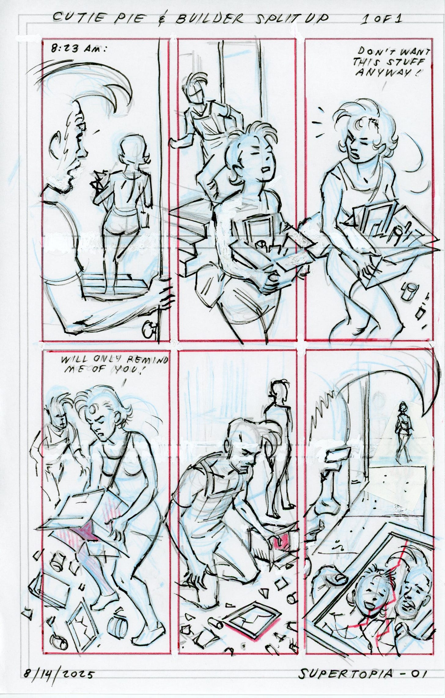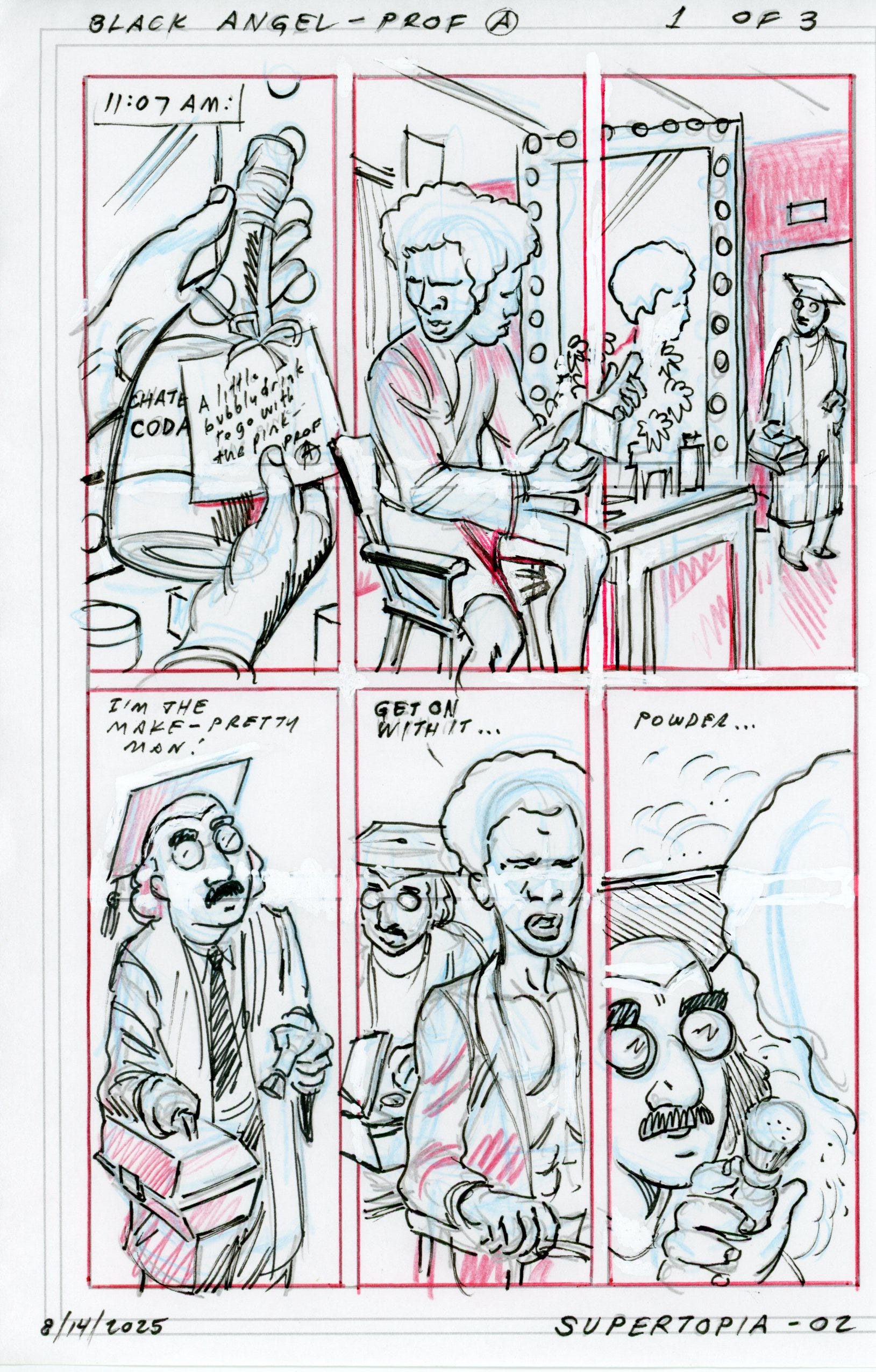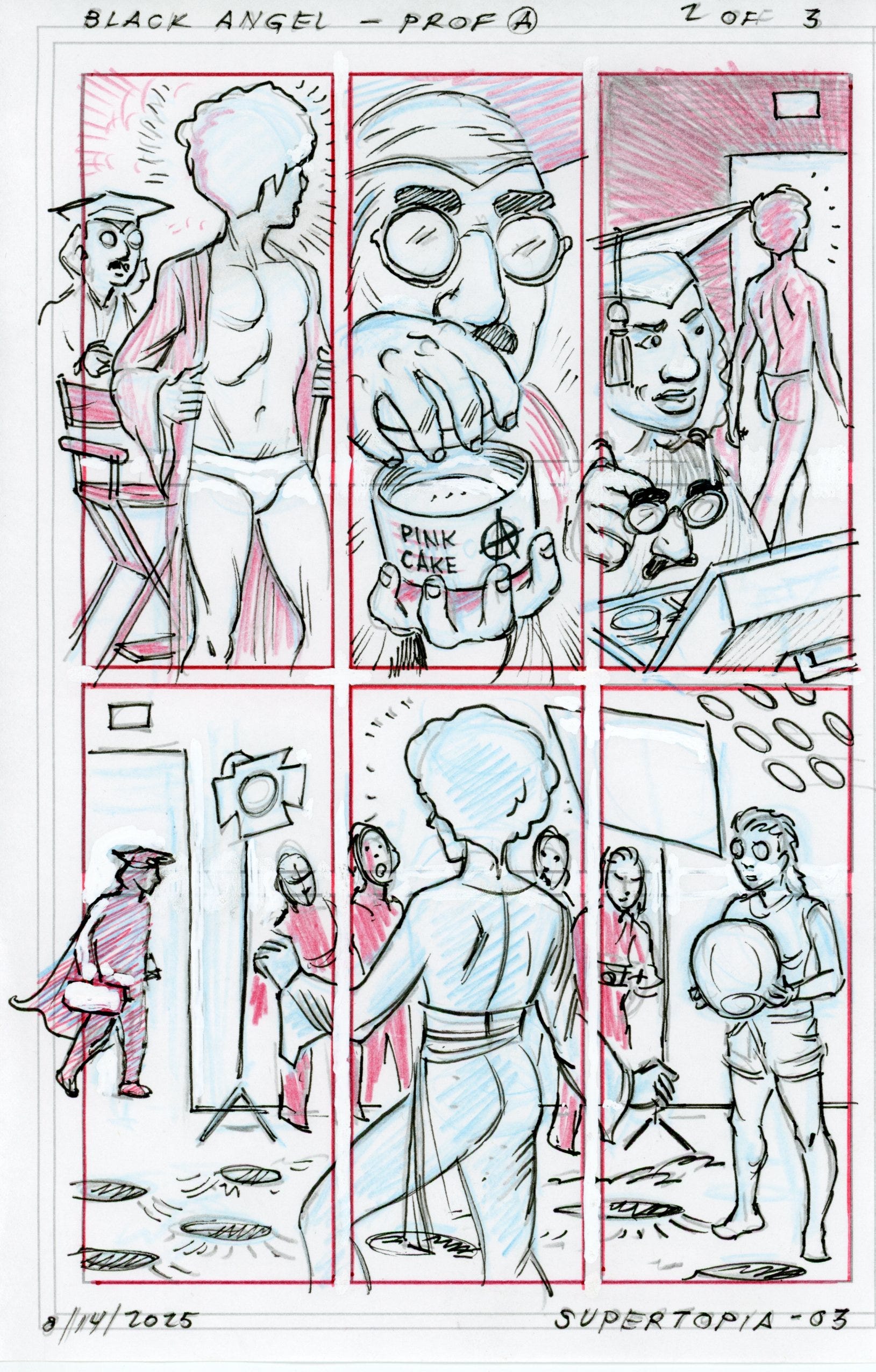 These are the first four pages in rough thumbnail layout (5.5” x 8.5”, half a sheet of letter-size bond paper) for a sequence for Amanda Stella Powers and Tom Powers’ graphic novel Supertopia—a 280-page spectacular!